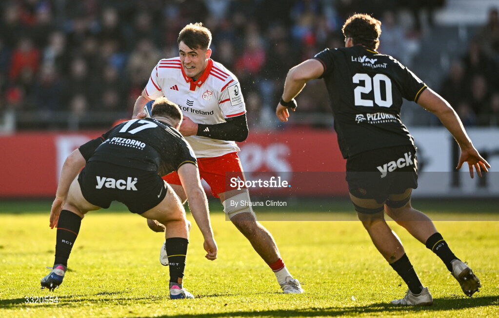 11 January 2026; Brian Gleeson of Munster in action against Leo Ametlla of RC Toulon during the Investec Champions Cup match between RC Toulon and Munster at Stade Felix Mayol in Toulon, France. Photo by Shauna Clinton/Sportsfile