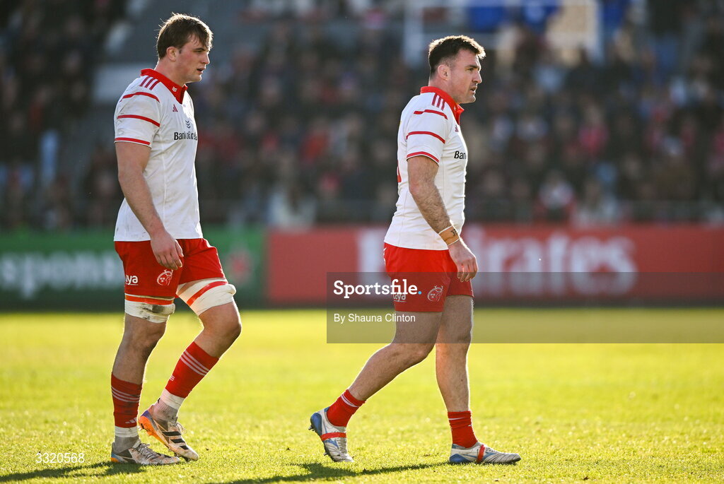 11 January 2026; Munster players Gavin Coombes, left, and Niall Scannell during the Investec Champions Cup match between RC Toulon and Munster at Stade Felix Mayol in Toulon, France. Photo by Shauna Clinton/Sportsfile