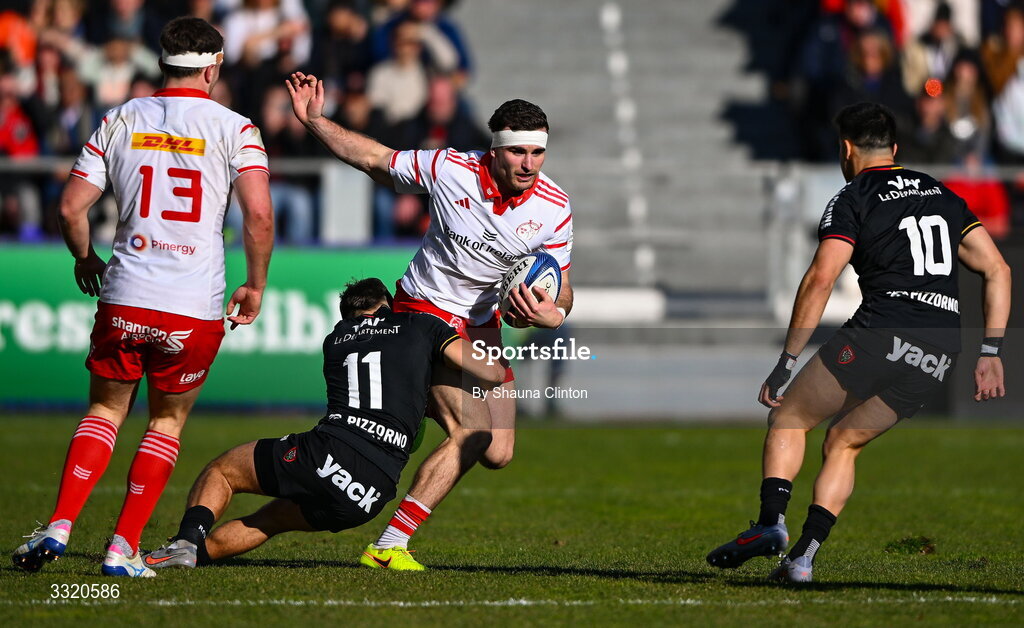 11 January 2026; Shane Daly of Munster is tackled by Mathis Ferte of RC Toulon during the Investec Champions Cup match between RC Toulon and Munster at Stade Felix Mayol in Toulon, France. Photo by Shauna Clinton/Sportsfile