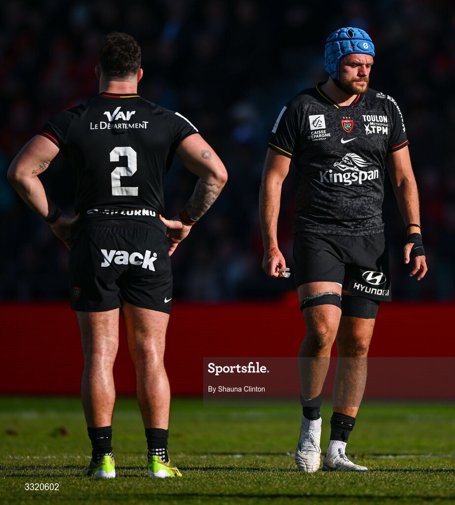 11 January 2026; RC Toulon players Zach Mercer, right, and Teddy Baubigny during the Investec Champions Cup match between RC Toulon and Munster at Stade Felix Mayol in Toulon, France. Photo by Shauna Clinton/Sportsfile