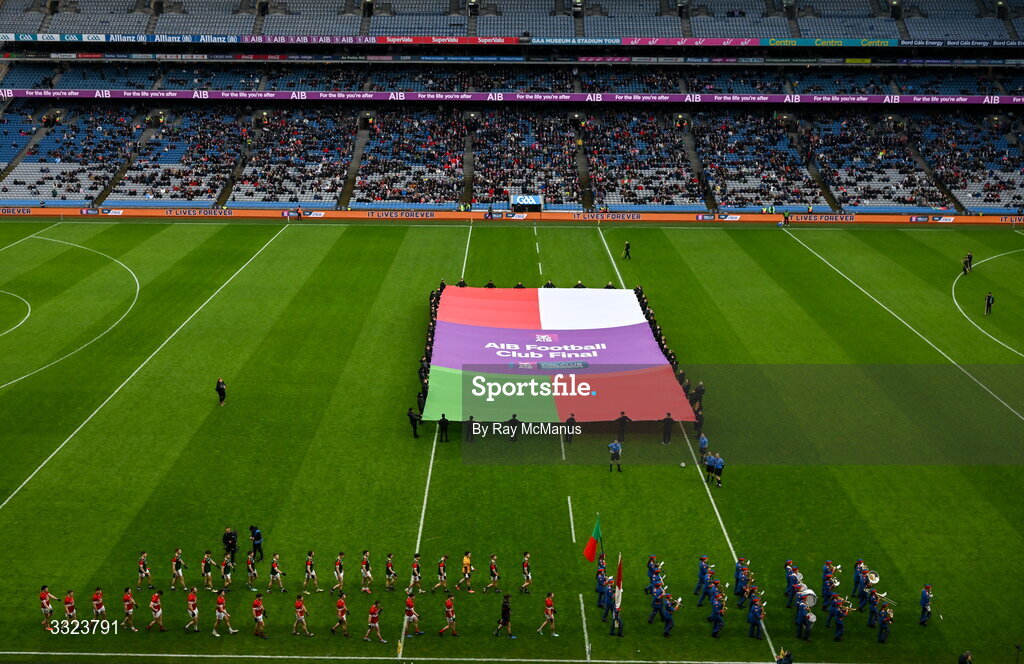 18 January 2026; Dingle and St Brigid's players march behind the Artane Band before the AIB GAA Football Senior Club Championship final match between Dingle of Kerry and St Brigid's of Roscommon at Croke Park in Dublin. Photo by Ray McManus/Sportsfile
