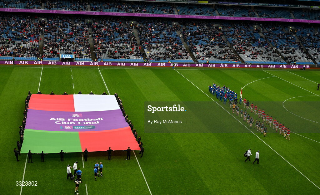 18 January 2026; Dingle and St Brigid's players march behind the Artane Band before the AIB GAA Football Senior Club Championship final match between Dingle of Kerry and St Brigid's of Roscommon at Croke Park in Dublin. Photo by Ray McManus/Sportsfile