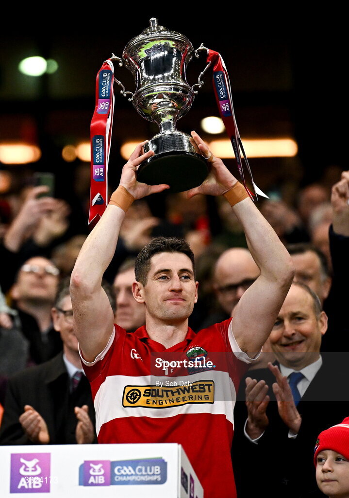 18 January 2026; Dingle captain Paul Geaney lifts the Andy Merrigan Cup after his side's victory in the AIB GAA Football Senior Club Championship final match between Dingle of Kerry and St Brigid's of Roscommon at Croke Park in Dublin. Photo by Seb Daly/Sportsfile