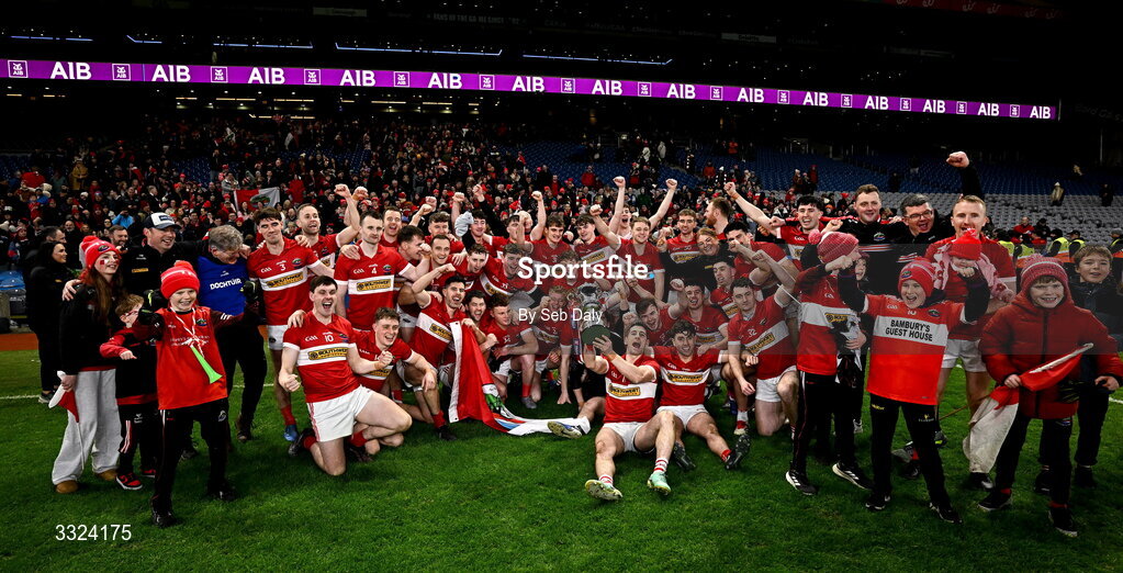 18 January 2026; Dingle players and supporters celebrate with the Andy Merrigan Cup after their side's victory in during the AIB GAA Football Senior Club Championship final match between Dingle of Kerry and St Brigid's of Roscommon at Croke Park in Dublin. Photo by Seb Daly/Sportsfile