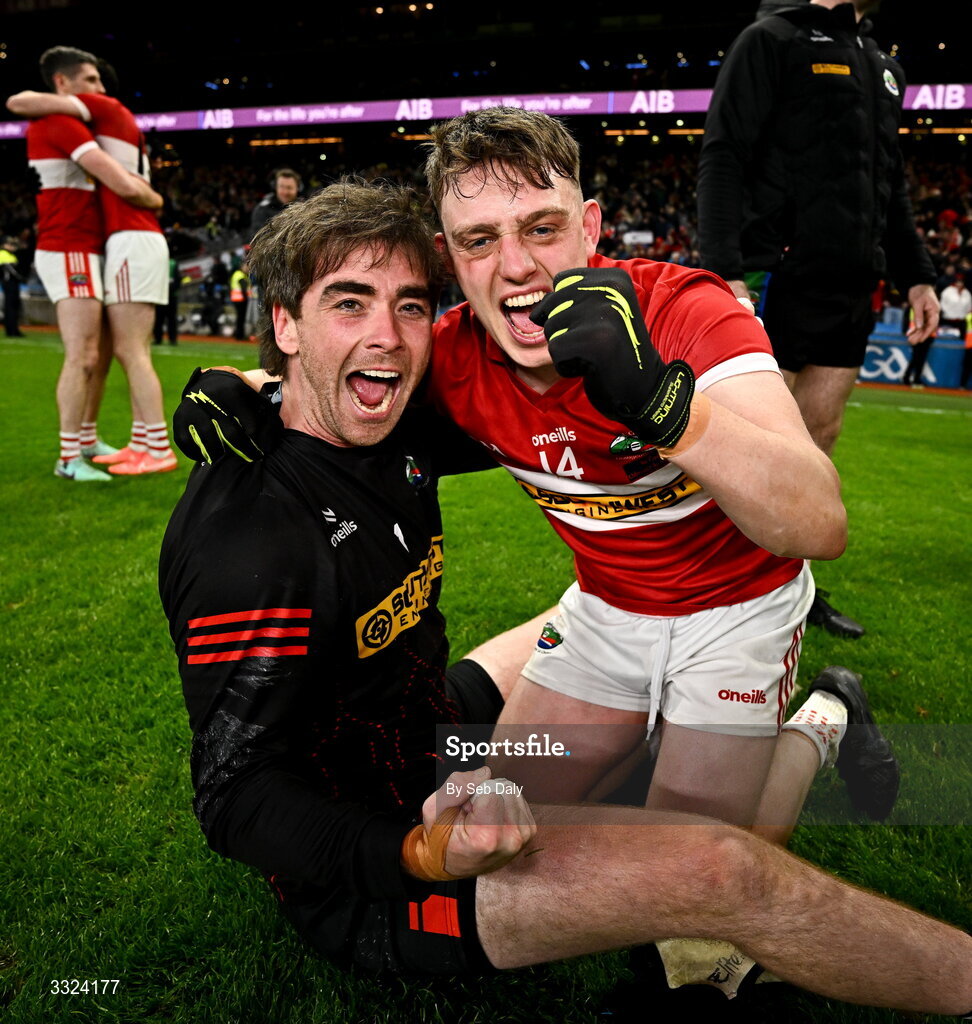 18 January 2026; Dingle players Gavin Curran, left, and Matthew Flaherty celebrate after their side's victory in the AIB GAA Football Senior Club Championship final match between Dingle of Kerry and St Brigid's of Roscommon at Croke Park in Dublin. Photo by Seb Daly/Sportsfile
