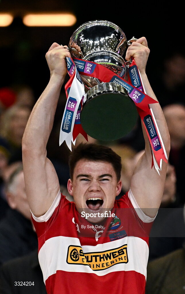 18 January 2026; Conor Flannery of Dingle lifts the Andy Merrigan Cup after his side's victory in the AIB GAA Football Senior Club Championship final match between Dingle of Kerry and St Brigid's of Roscommon at Croke Park in Dublin. Photo by Seb Daly/Sportsfile