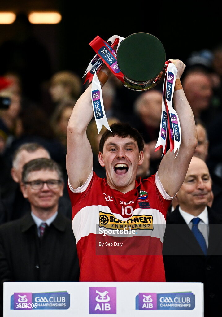 18 January 2026; Tadhg Browne of Dingle lifts the Andy Merrigan Cup after his side's victory in the AIB GAA Football Senior Club Championship final match between Dingle of Kerry and St Brigid's of Roscommon at Croke Park in Dublin. Photo by Seb Daly/Sportsfile