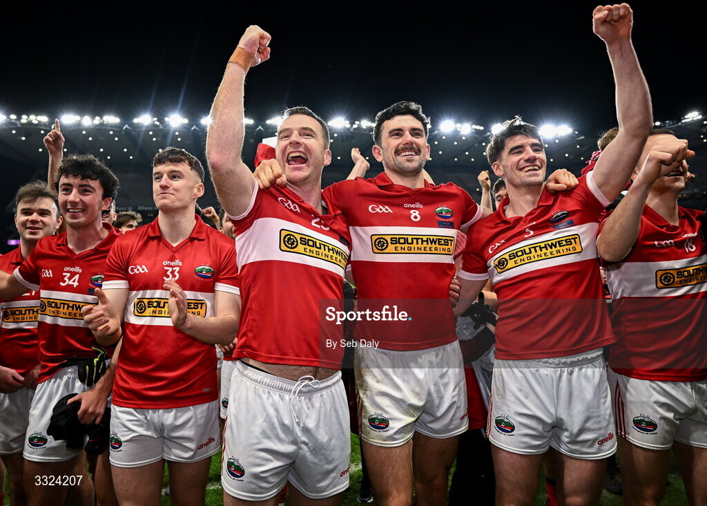 18 January 2026; Dingle players Darragh O'Sullivan, Mark O'Connor and Tom O'Sullivan celebrate after their side's victory in the AIB GAA Football Senior Club Championship final match between Dingle of Kerry and St Brigid's of Roscommon at Croke Park in Dublin. Photo by Seb Daly/Sportsfile