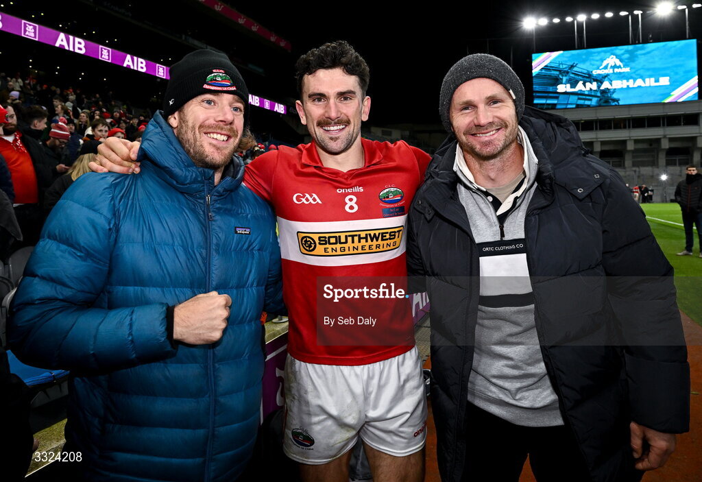 18 January 2026; Dingle's Mark O'Connor, centre, celebrates with his Australian Football League club teammates Cameron Gutherie, left, and Patrick Dangerfield of Geelong Football Club after the AIB GAA Football Senior Club Championship final match between Dingle of Kerry and St Brigid's of Roscommon at Croke Park in Dublin. Photo by Seb Daly/Sportsfile