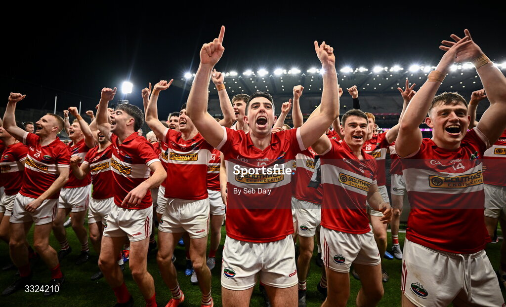 18 January 2026; Dylan Geaney of Dingle, centre, and teammates celebrate after their side's victory in the AIB GAA Football Senior Club Championship final match between Dingle of Kerry and St Brigid's of Roscommon at Croke Park in Dublin. Photo by Seb Daly/Sportsfile