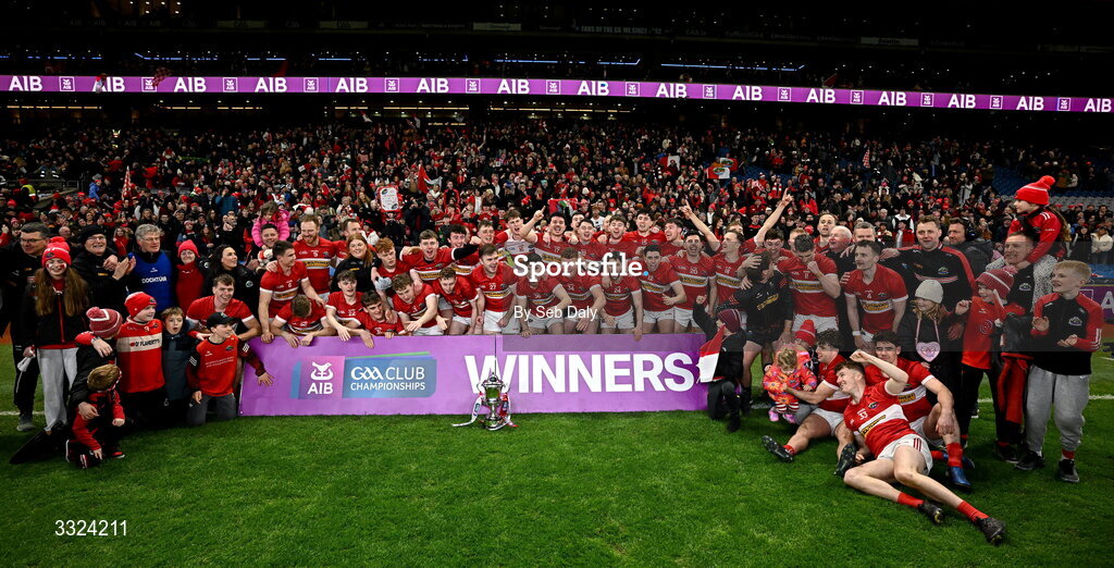 18 January 2026; Dingle players, coaches and supporters celebrate with the Andy Merrigan Cup after their side's victory in the AIB GAA Football Senior Club Championship final match between Dingle of Kerry and St Brigid's of Roscommon at Croke Park in Dublin. Photo by Seb Daly/Sportsfile
