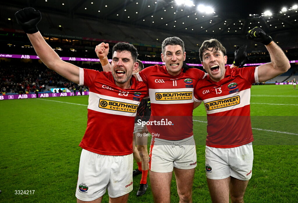 18 January 2026; Dingle players Paul Geaney, centre, celebrates with teammates Mikey Geaney, left, and Conor Geaney after their side's victory in the AIB GAA Football Senior Club Championship final match between Dingle of Kerry and St Brigid's of Roscommon at Croke Park in Dublin. Photo by Seb Daly/Sportsfile