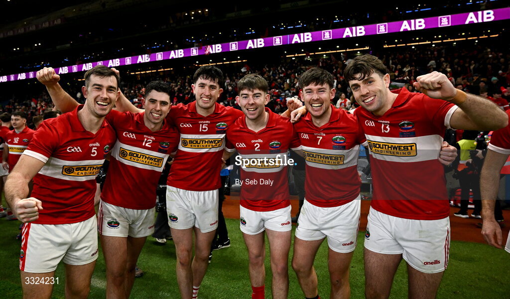 18 January 2026; Dingle players, from left, Aidan O'Connor, Dylan Geaney, Niall Geaney, Brian O'Connor, Patrick O'Connor, and Conor Geaney, celebrate after their side's victory in the AIB GAA Football Senior Club Championship final match between Dingle of Kerry and St Brigid's of Roscommon at Croke Park in Dublin. Photo by Seb Daly/Sportsfile