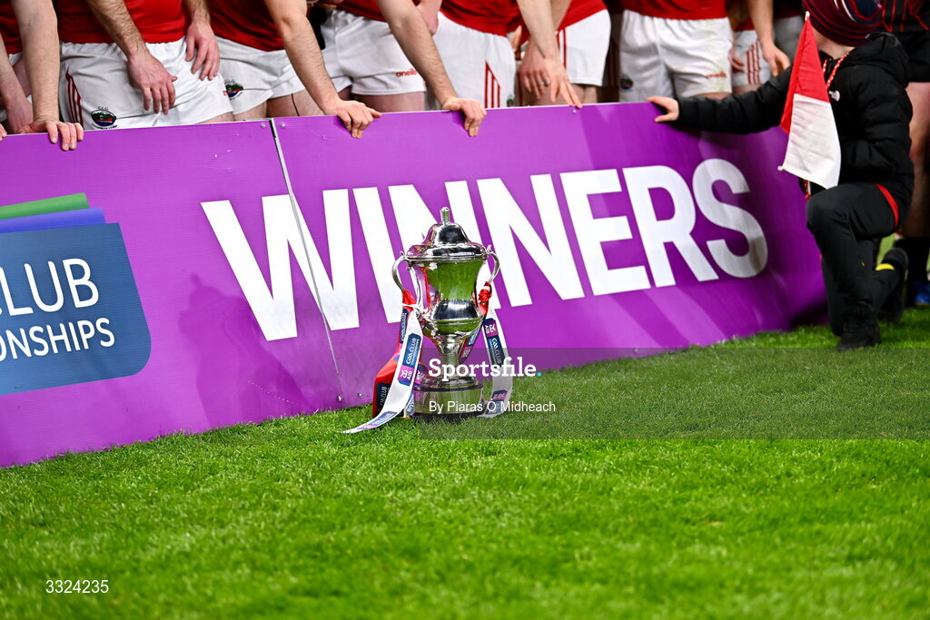18 January 2026; The Andy Merrigan Cup during the Dingle celebrations after the AIB GAA Football Senior Club Championship final match between Dingle of Kerry and St Brigid's of Roscommon at Croke Park in Dublin. Photo by Piaras Ó Mídheach/Sportsfile