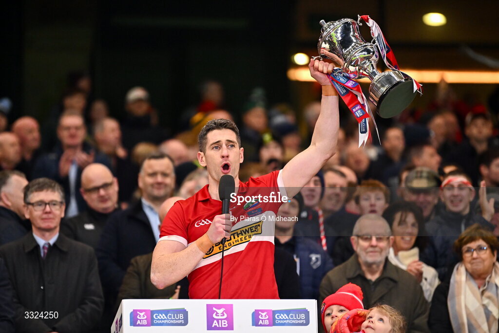 18 January 2026; Dingle captain Paul Geaney celebrate with the Andy Merrigan Cup after the AIB GAA Football Senior Club Championship final match between Dingle of Kerry and St Brigid's of Roscommon at Croke Park in Dublin. Photo by Piaras Ó Mídheach/Sportsfile