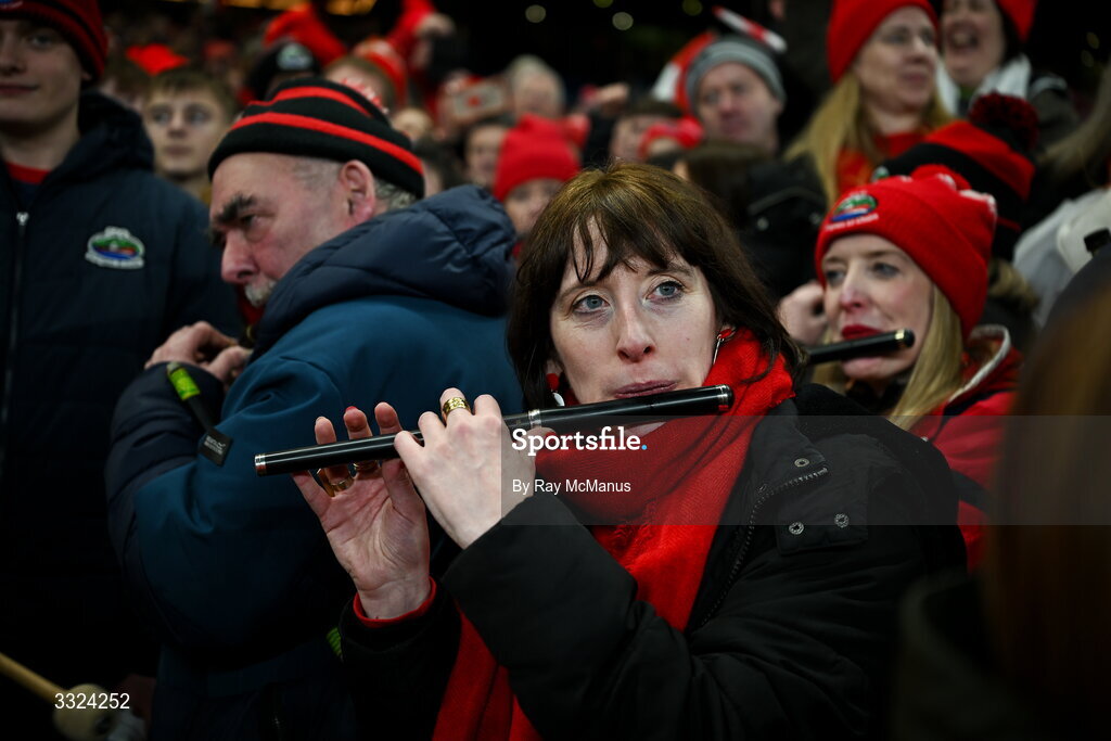 18 January 2026; A Dingle supporter plays a flute in celebration after the AIB GAA Football Senior Club Championship final match between Dingle of Kerry and St Brigid's of Roscommon at Croke Park in Dublin. Photo by Ray McManus/Sportsfile