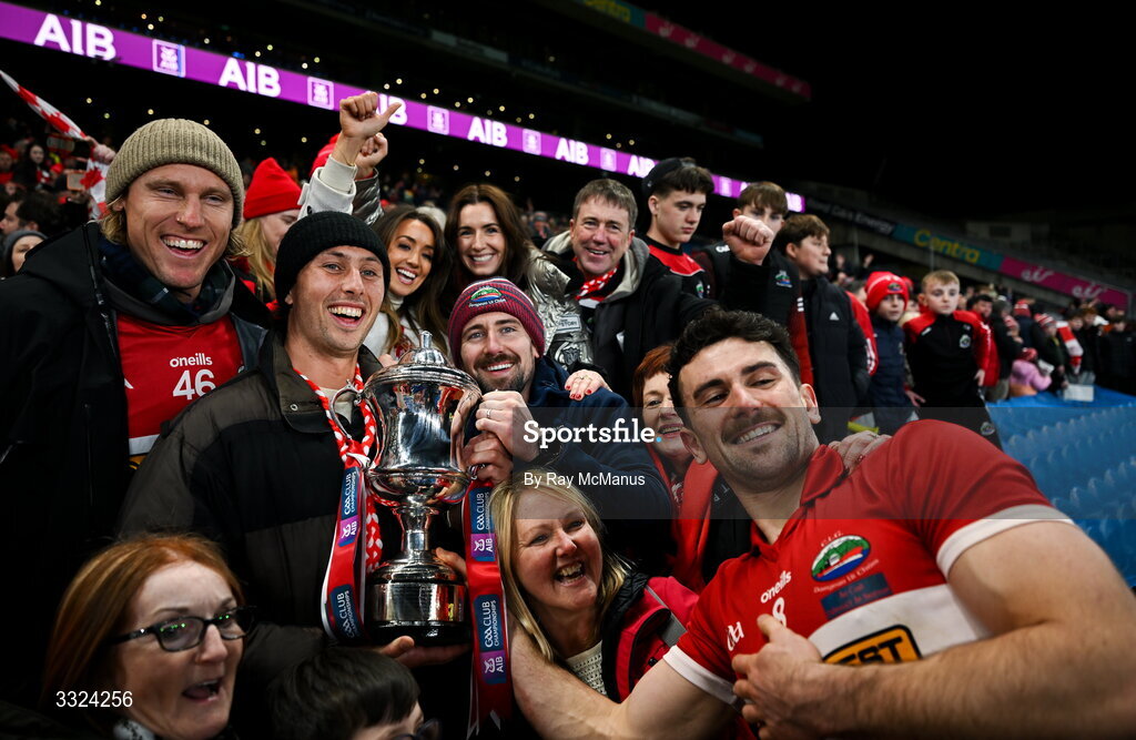 18 January 2026; Mark O'Connor of Dingle with Geelong players Jack Henry and Mark Blicas and his brother Hohn with the Andy Merrigan Cup after the AIB GAA Football Senior Club Championship final match between Dingle of Kerry and St Brigid's of Roscommon at Croke Park in Dublin. Photo by Ray McManus/Sportsfile
