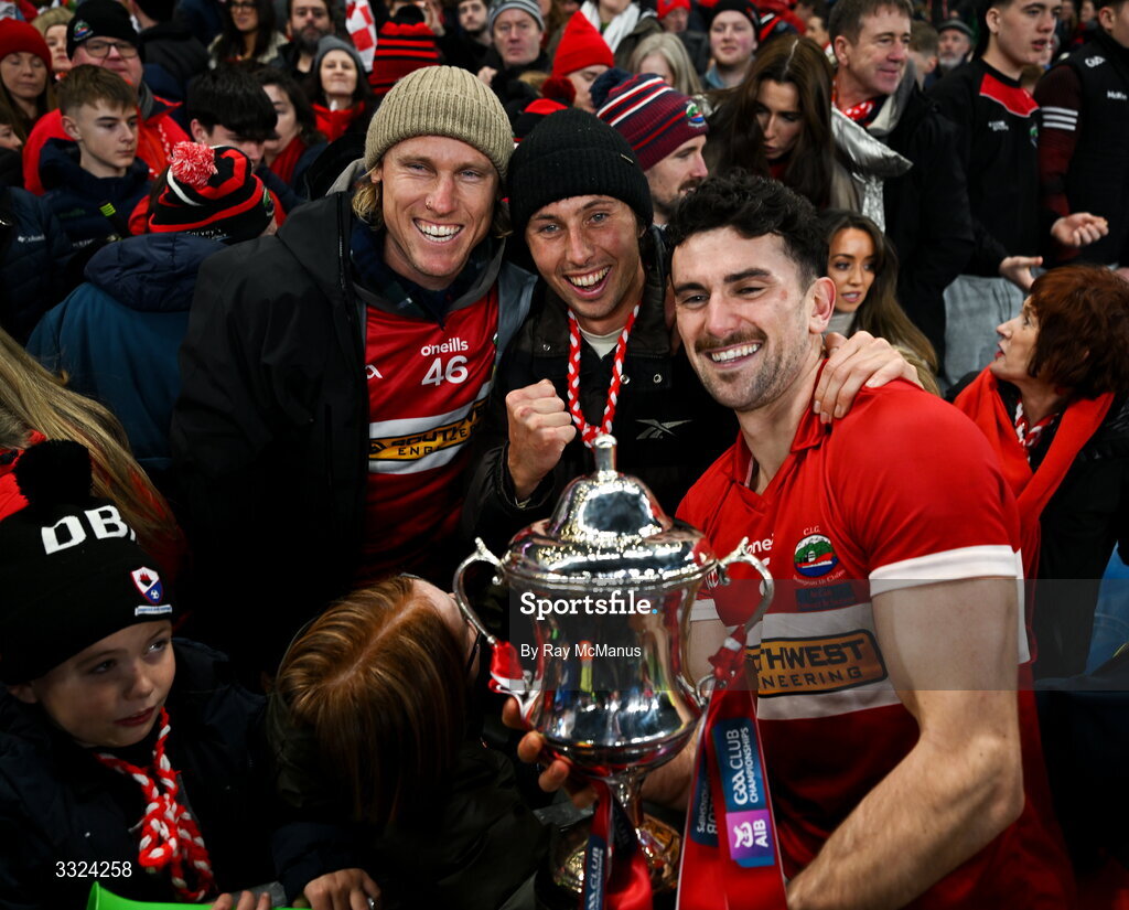 18 January 2026; Mark O'Connor of Dingle with Geelong players Jack Henry and Mark Blicas and the Andy Merrigan Cup after the AIB GAA Football Senior Club Championship final match between Dingle of Kerry and St Brigid's of Roscommon at Croke Park in Dublin. Photo by Ray McManus/Sportsfile
