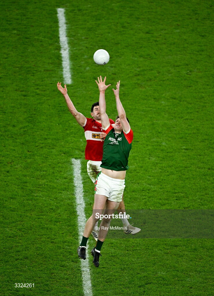 18 January 2026; Shane Cunnane of St Brigid's and Mark O'Connor of Dingle contest the trow in to start extra time during the AIB GAA Football Senior Club Championship final match between Dingle of Kerry and St Brigid's of Roscommon at Croke Park in Dublin. Photo by Ray McManus/Sportsfile