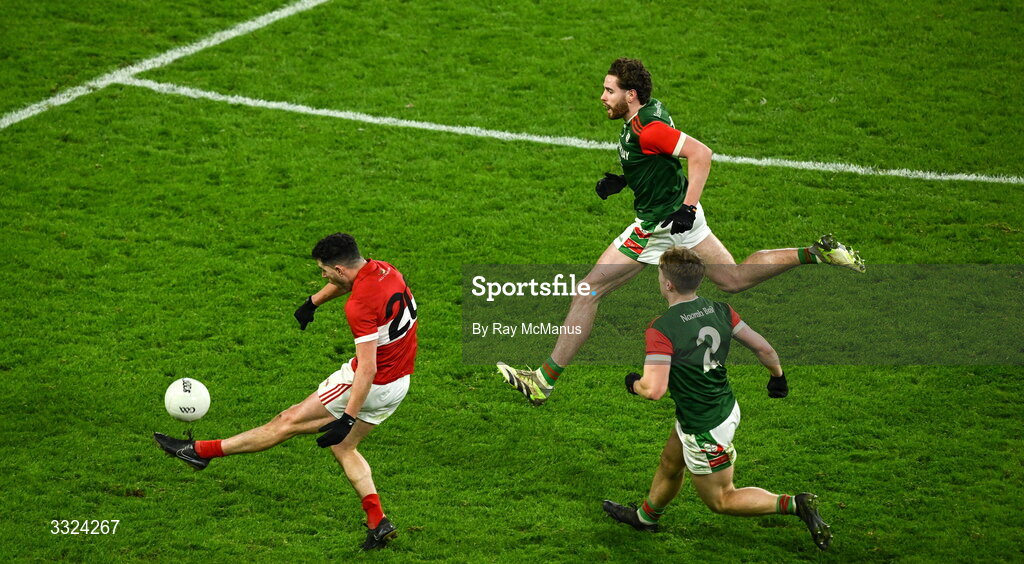 18 January 2026; Pearse Frost and Eddie Nolan of St Brigid's can only watch as Mikey Geaney of Dingle kicks what proved to be the winning kick, a single point, during the AIB GAA Football Senior Club Championship final match between Dingle of Kerry and St Brigid's of Roscommon at Croke Park in Dublin. Photo by Ray McManus/Sportsfile