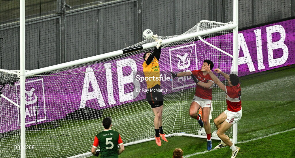 18 January 2026; St Brigid's goalkeeper Conor Carroll cannot prevent the ball, kicked by Mikey Geaney of Dingle, from going over the bar during the AIB GAA Football Senior Club Championship final match between Dingle of Kerry and St Brigid's of Roscommon at Croke Park in Dublin. Photo by Ray McManus/Sportsfile