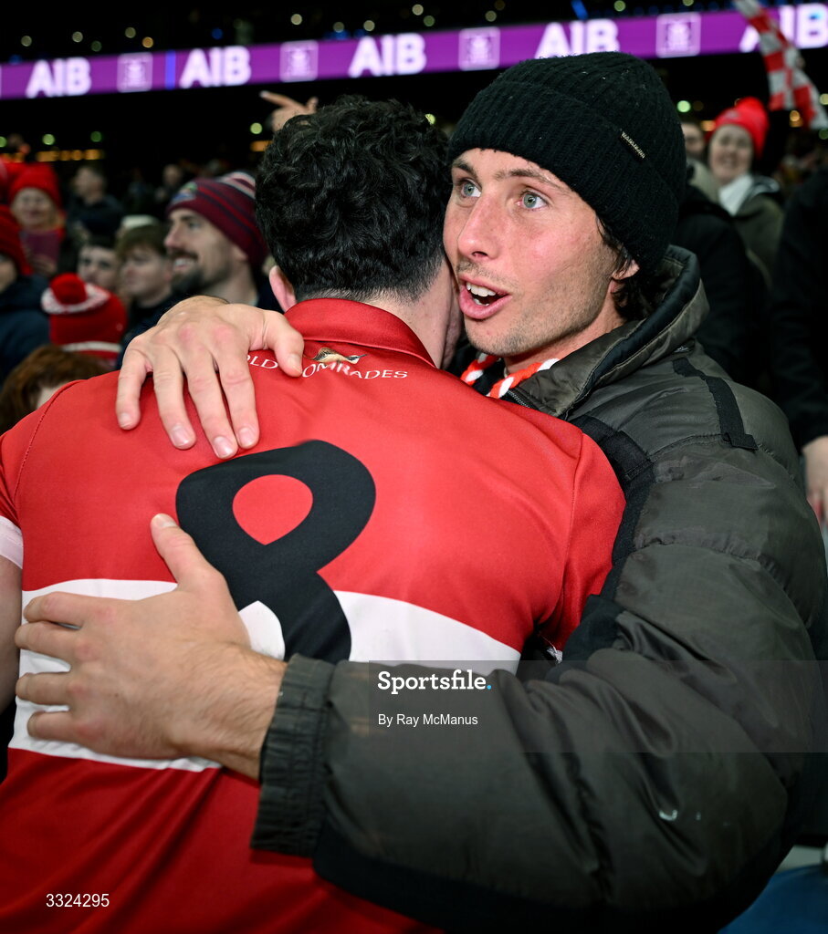 18 January 2026; Mark O'Connor of Dingle is congratulated by Geelong player Jack Henry after the AIB GAA Football Senior Club Championship final match between Dingle of Kerry and St Brigid's of Roscommon at Croke Park in Dublin. Photo by Ray McManus/Sportsfile
