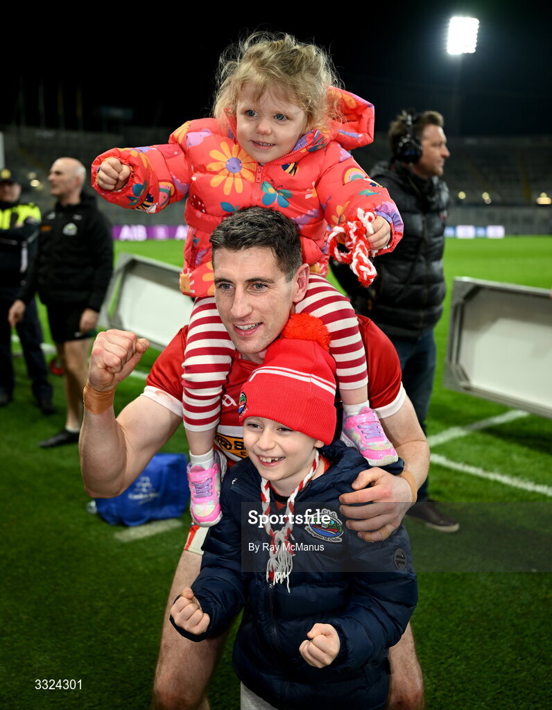 18 January 2026; Dingle captain Paul Geaney with his daughter Christina and his son Paidi after the AIB GAA Football Senior Club Championship final match between Dingle of Kerry and St Brigid's of Roscommon at Croke Park in Dublin. Photo by Ray McManus/Sportsfile