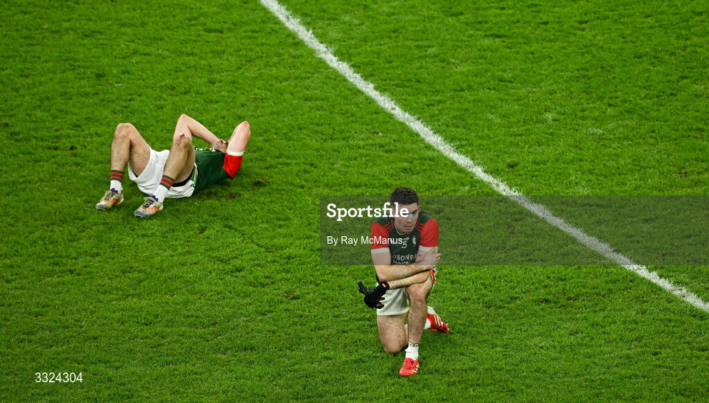 18 January 2026; Ruaidhrí Fallon and Seán Trundle, left, of St Brigid's after the AIB GAA Football Senior Club Championship final match between Dingle of Kerry and St Brigid's of Roscommon at Croke Park in Dublin. Photo by Ray McManus/Sportsfile