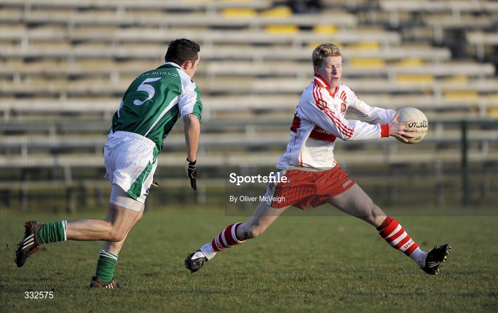 4 January 2009; Enda Lynn, Derry, in action against Damian Kelly, Fermanagh. Gaelic Life Dr. McKenna Cup, Section A, Round 1, Fermanagh v Derry, Brewster Park, Enniskillen, Fermanagh. Picture credit: Oliver McVeigh / SPORTSFILE