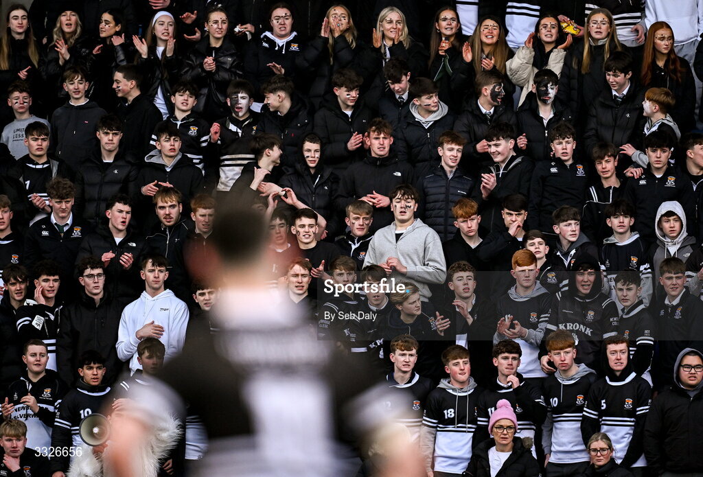 23 January 2026; Newbridge College supporters during the Bank of Ireland Leinster Rugby Boys Schools Senior Cup first round match between Newbridge College and Wesley College at Energia Park in Dublin. Photo by Seb Daly/Sportsfile