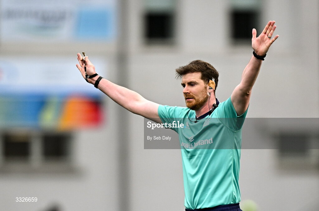 23 January 2026; Referee Kevin Beakey during the Bank of Ireland Leinster Rugby Boys Schools Senior Cup first round match between Newbridge College and Wesley College at Energia Park in Dublin. Photo by Seb Daly/Sportsfile