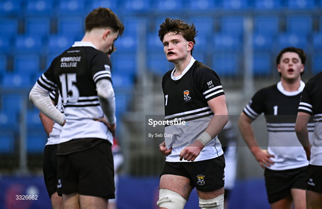 23 January 2026; Jonathan Fardy of Newbridge College, centre, and teammates after their side conceded a third try during the Bank of Ireland Leinster Rugby Boys Schools Senior Cup first round match between Newbridge College and Wesley College at Energia Park in Dublin. Photo by Seb Daly/Sportsfile