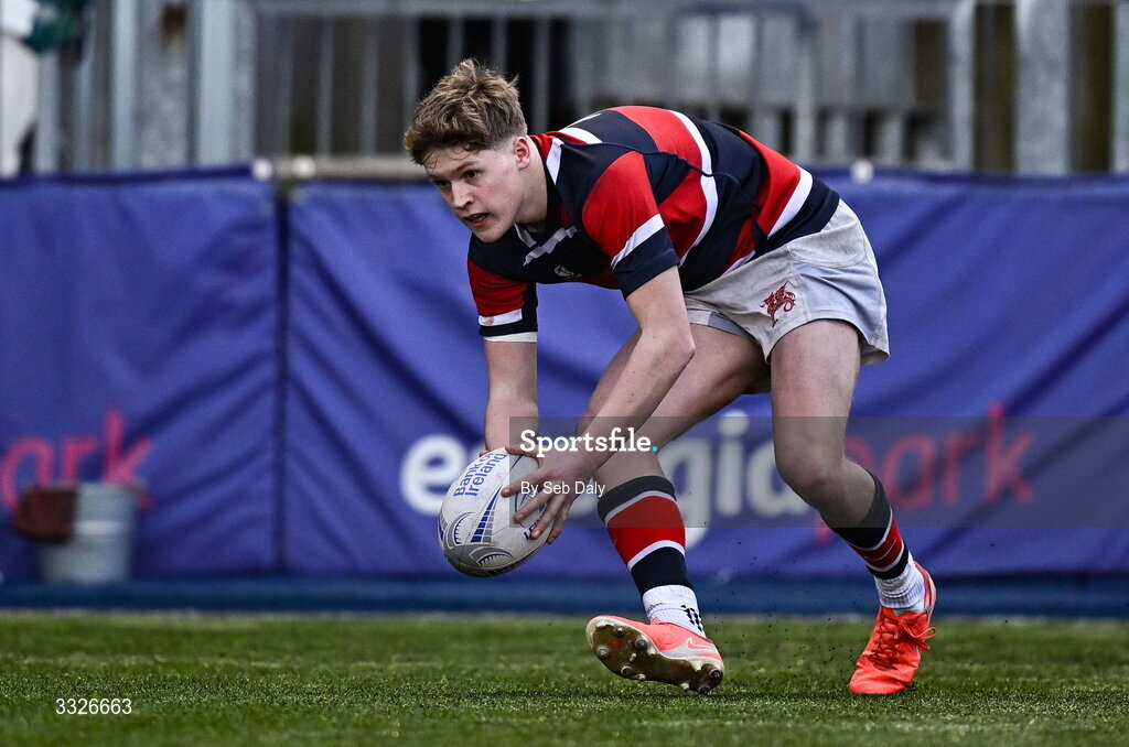 23 January 2026; Alex Hamilton of Wesley College scores his side's third try during the Bank of Ireland Leinster Rugby Boys Schools Senior Cup first round match between Newbridge College and Wesley College at Energia Park in Dublin. Photo by Seb Daly/Sportsfile