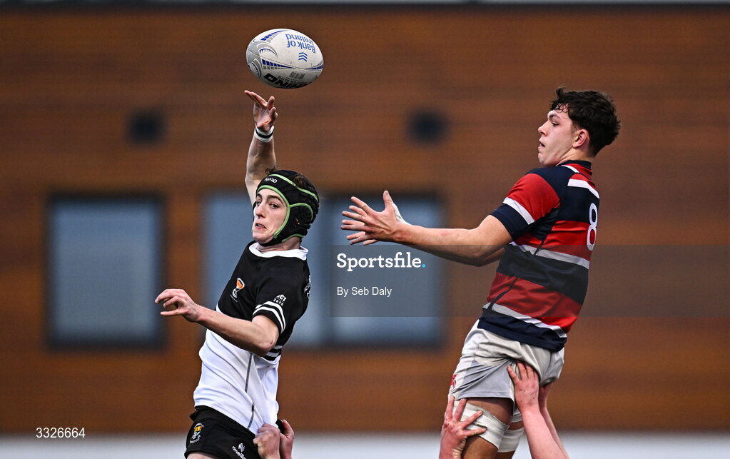 23 January 2026; Jack Garvey of Newbridge College takes possession in a lineout ahead of Thibault Campbell of Wesley College during the Bank of Ireland Leinster Rugby Boys Schools Senior Cup first round match between Newbridge College and Wesley College at Energia Park in Dublin. Photo by Seb Daly/Sportsfile