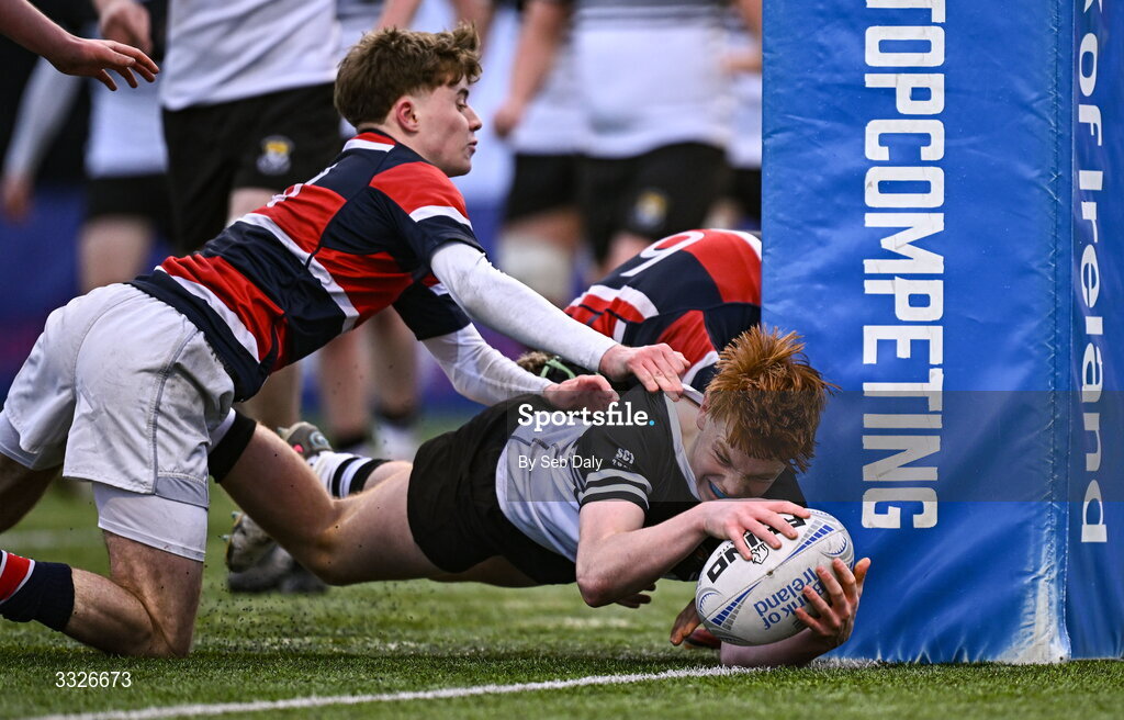 23 January 2026; Michael Kenny of Newbridge College scores his side's third try during the Bank of Ireland Leinster Rugby Boys Schools Senior Cup first round match between Newbridge College and Wesley College at Energia Park in Dublin. Photo by Seb Daly/Sportsfile