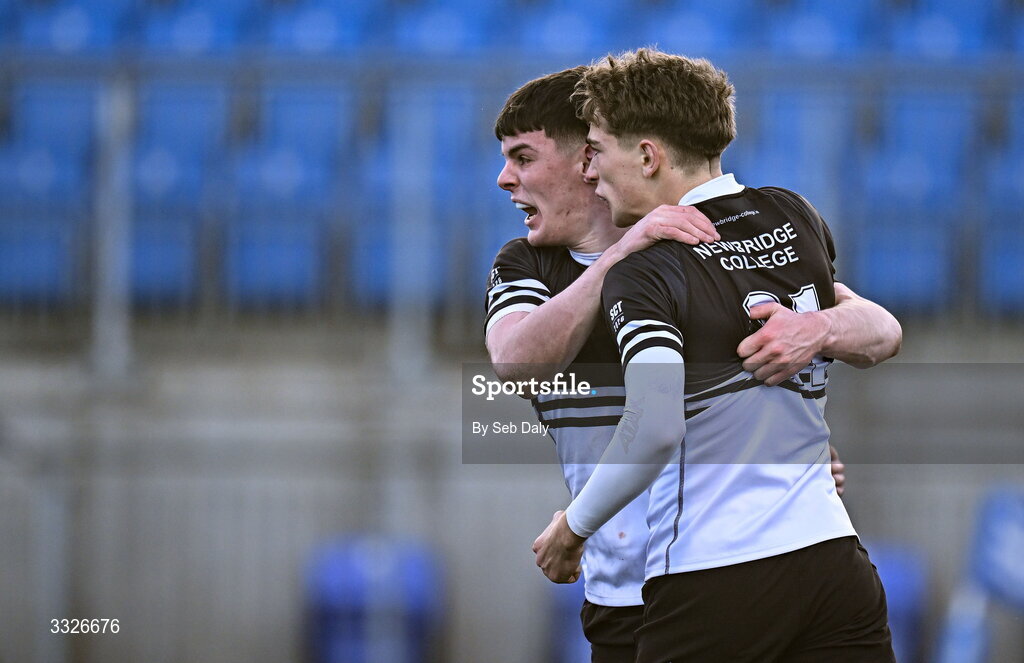 23 January 2026; Luke Kelly of Newbridge College, left, celebrates with teammate Ryan Conroy after scoring their side's fifth try during the Bank of Ireland Leinster Rugby Boys Schools Senior Cup first round match between Newbridge College and Wesley College at Energia Park in Dublin. Photo by Seb Daly/Sportsfile