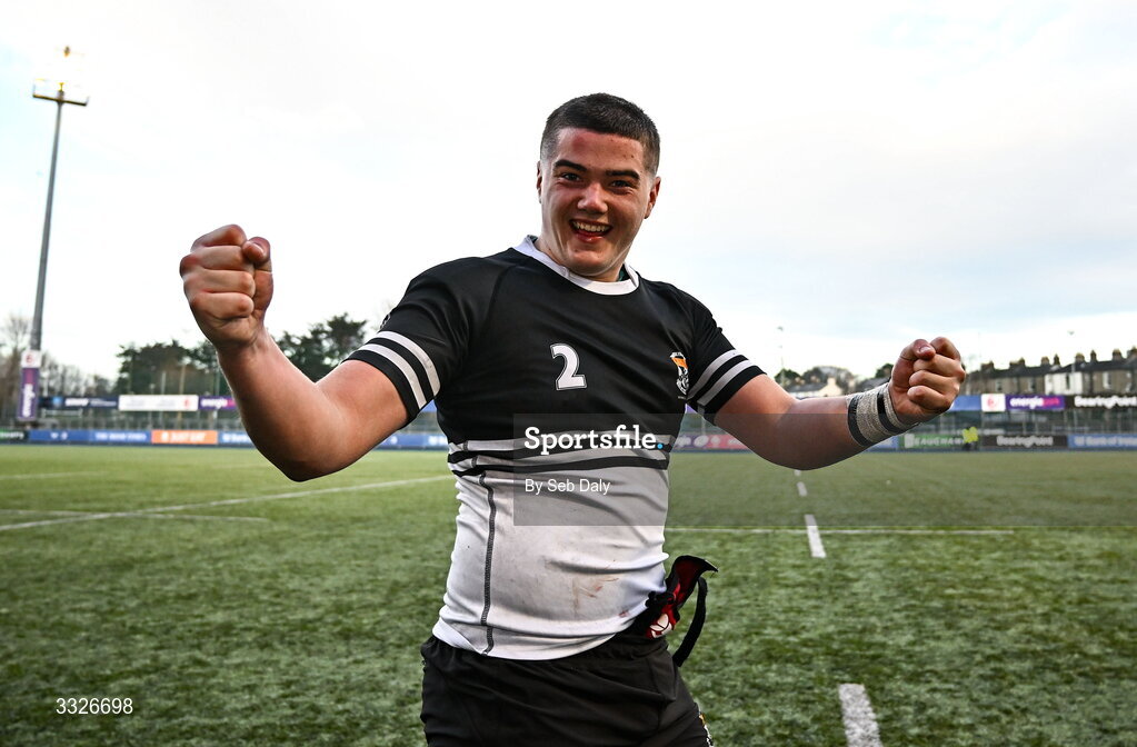 23 January 2026; Brion Donagh of Newbridge College celebrates after his side's victory in the Bank of Ireland Leinster Rugby Boys Schools Senior Cup first round match between Newbridge College and Wesley College at Energia Park in Dublin. Photo by Seb Daly/Sportsfile