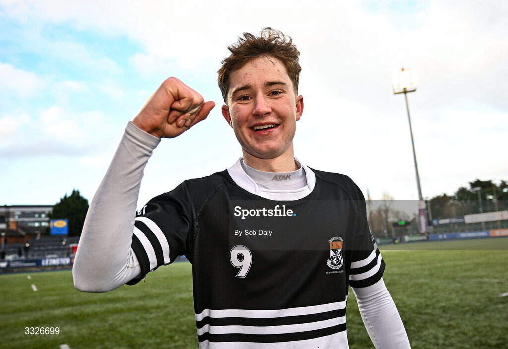 23 January 2026; Max Rainbow of Newbridge College celebrates after his side's victory in the Bank of Ireland Leinster Rugby Boys Schools Senior Cup first round match between Newbridge College and Wesley College at Energia Park in Dublin. Photo by Seb Daly/Sportsfile