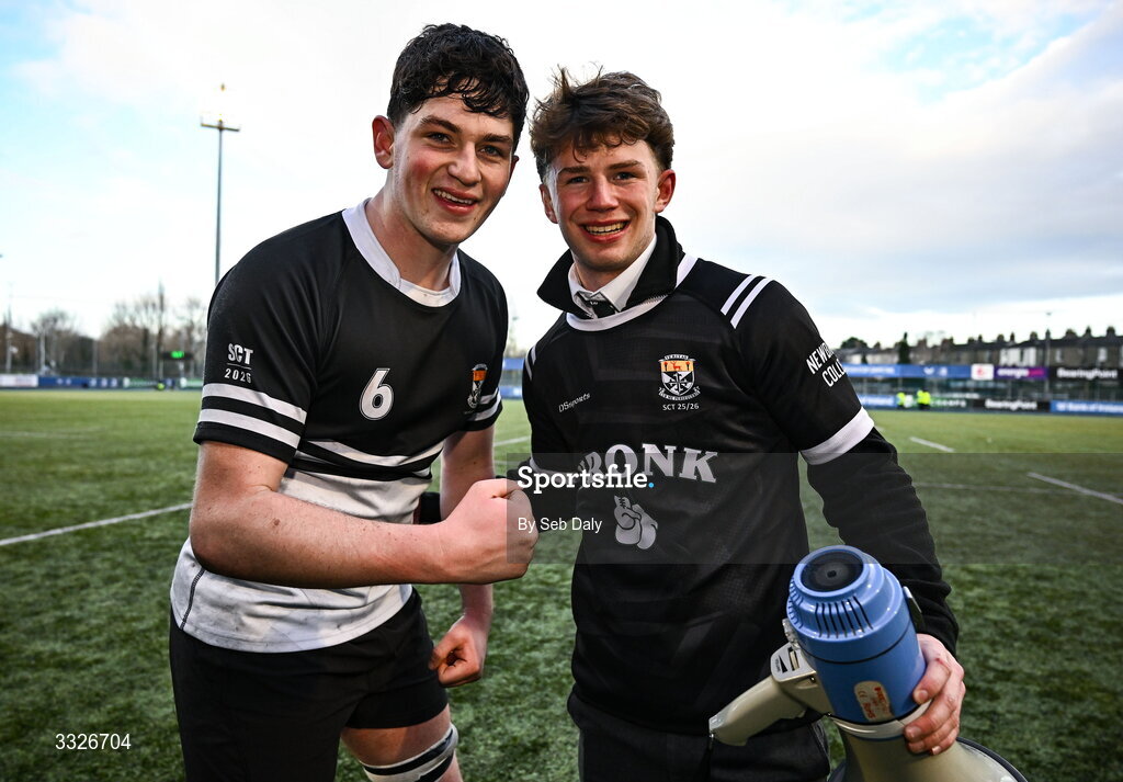 23 January 2026; Cillian O'Donovan of Newbridge College and supporter Giles Healy celebrate after their side's victory in during the Bank of Ireland Leinster Rugby Boys Schools Senior Cup first round match between Newbridge College and Wesley College at Energia Park in Dublin. Photo by Seb Daly/Sportsfile