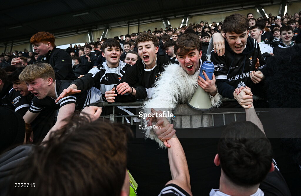 23 January 2026; Newbridge College supporters celebrate after their side's victory in the Bank of Ireland Leinster Rugby Boys Schools Senior Cup first round match between Newbridge College and Wesley College at Energia Park in Dublin. Photo by Seb Daly/Sportsfile