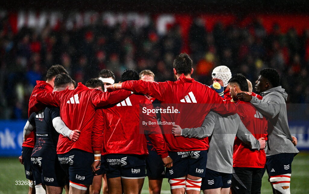 23 January 2026; Munster players huddle before the United Rugby Championship match between Munster and Dragons at Virgin Media Park in Cork. Photo by Ben McShane/Sportsfile