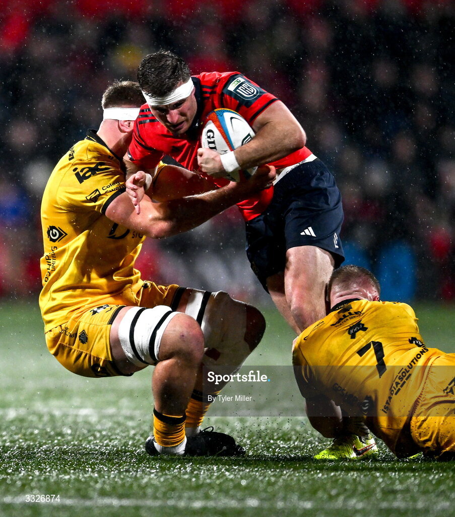 23 January 2026; Shane Daly of Munster is tackled by Ben Carter, left, and Harry Beddall of Dragons during the United Rugby Championship match between Munster and Dragons at Virgin Media Park in Cork. Photo by Tyler Miller/Sportsfile