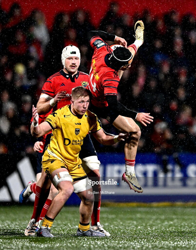 23 January 2026; Thaakir Abrahams of Munster gathers possession of the ball despite the tackle of Harry Beddall of Dragons during the United Rugby Championship match between Munster and Dragons at Virgin Media Park in Cork. Photo by Ben McShane/Sportsfile