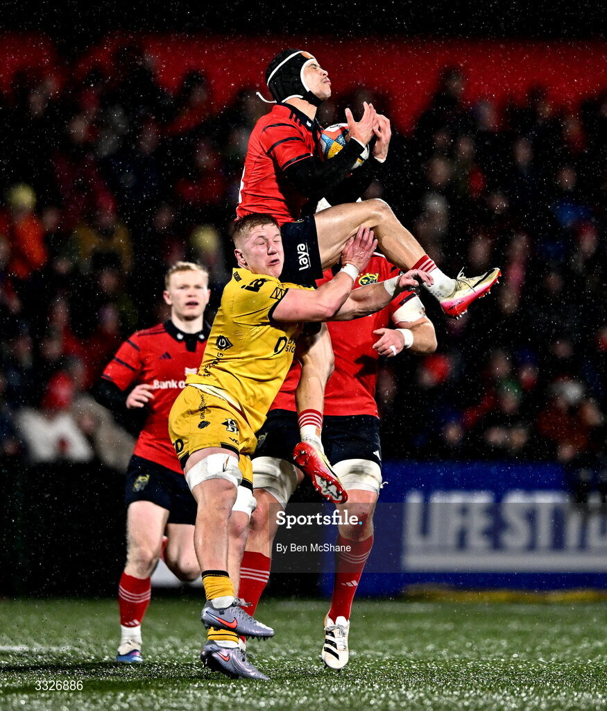 23 January 2026; Thaakir Abrahams of Munster gathers possession of the ball despite the attention of Harry Beddall of Dragons during the United Rugby Championship match between Munster and Dragons at Virgin Media Park in Cork. Photo by Ben McShane/Sportsfile