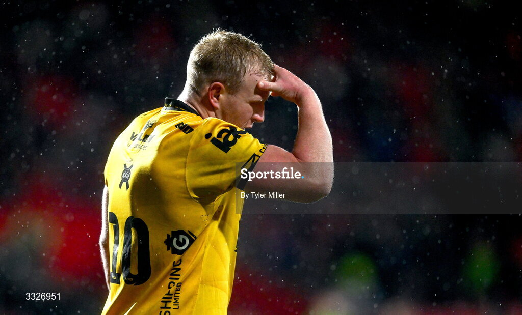 23 January 2026; Tinus de Beer of Dragons reacts during the United Rugby Championship match between Munster and Dragons at Virgin Media Park in Cork. Photo by Tyler Miller/Sportsfile