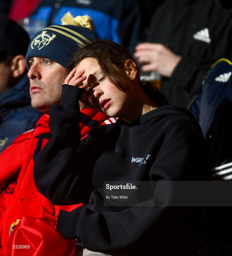 23 January 2026; A young Munster supporter reacts during the United Rugby Championship match between Munster and Dragons at Virgin Media Park in Cork. Photo by Tyler Miller/Sportsfile