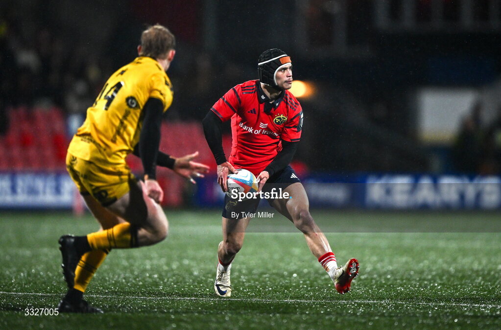 23 January 2026; Thaakir Abrahams of Munster during the United Rugby Championship match between Munster and Dragons at Virgin Media Park in Cork. Photo by Tyler Miller/Sportsfile