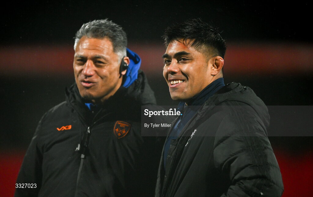 23 January 2026; Michael Ala'alatoa of Munster and Dragons head coach Filo Tiatia after the United Rugby Championship match between Munster and Dragons at Virgin Media Park in Cork. Photo by Tyler Miller/Sportsfile