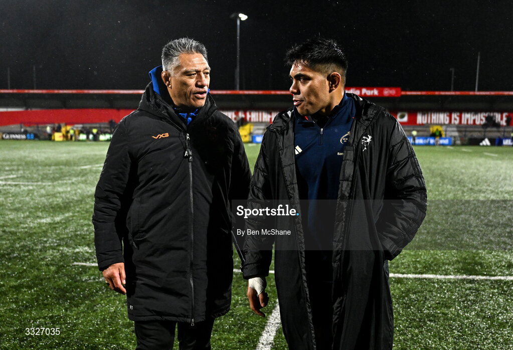 23 January 2026; Dragons head coach Filo Tiatia, left, and Michael Ala'alatoa of Munster in conversation after the United Rugby Championship match between Munster and Dragons at Virgin Media Park in Cork. Photo by Ben McShane/Sportsfile