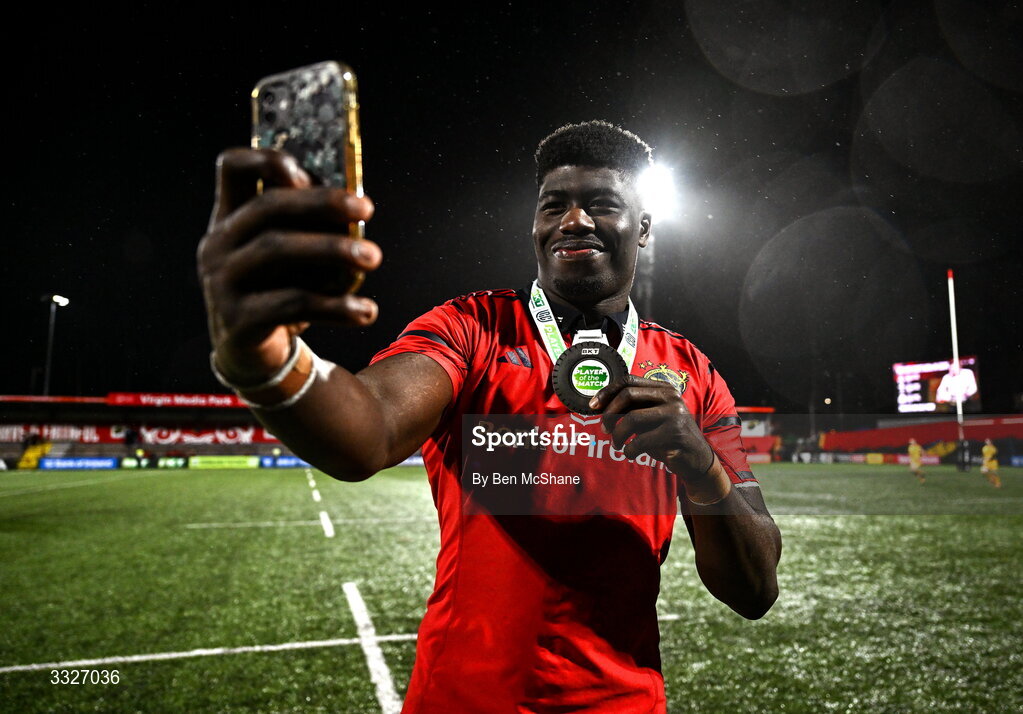 23 January 2026; Player of the match Sean Edogdo of Munster takes a selfie after the United Rugby Championship match between Munster and Dragons at Virgin Media Park in Cork. Photo by Ben McShane/Sportsfile